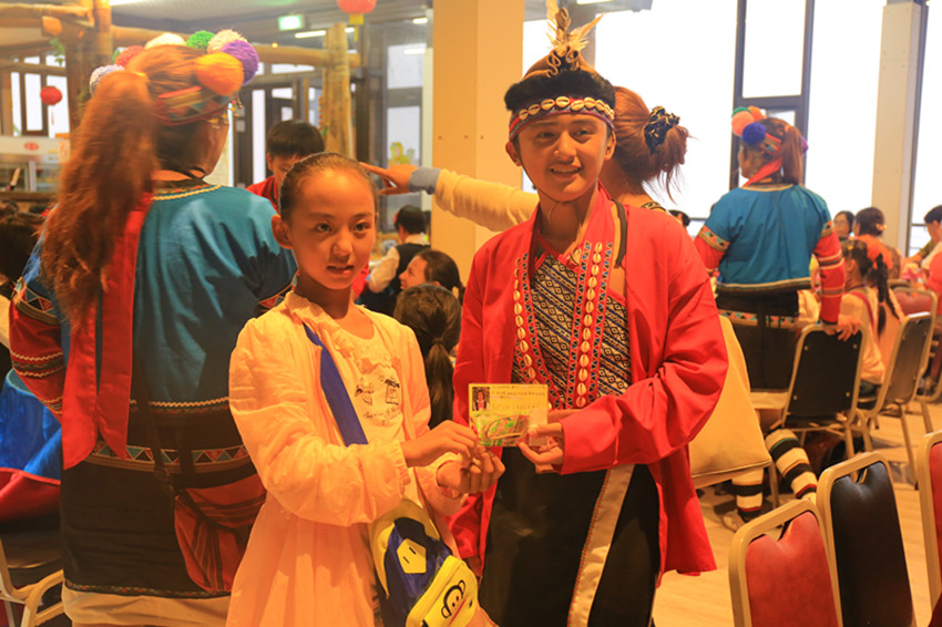 合唱團(tuán)的小朋友與阿里山小學(xué)小朋友互贈(zèng)卡片。
