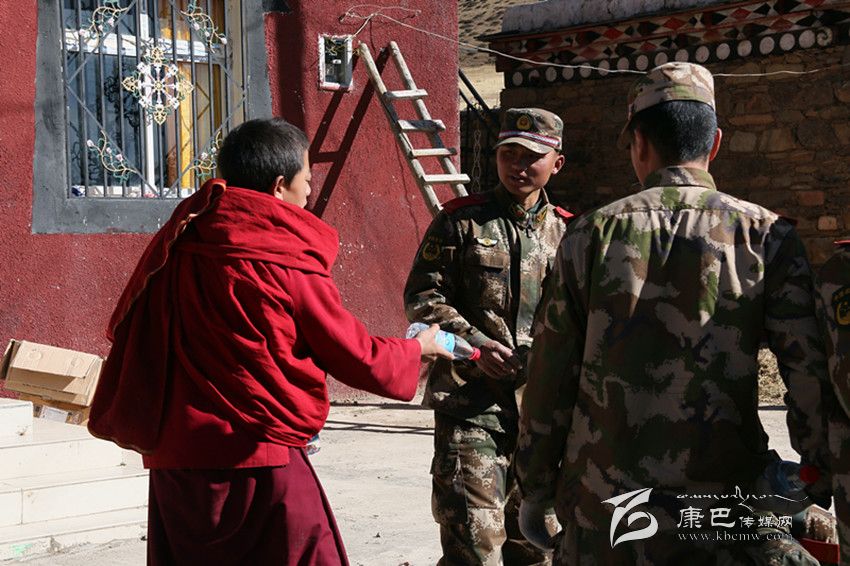 27日上午,記者一行來到金龍寺,看見院子里已經(jīng)搭起了一排排整齊的救災棉帳篷,當?shù)馗刹亢臀渚俦聫R僧人一道加固帳篷,僧人們從自己的帳篷里抱出礦泉水,送到武警戰(zhàn)士們手中。