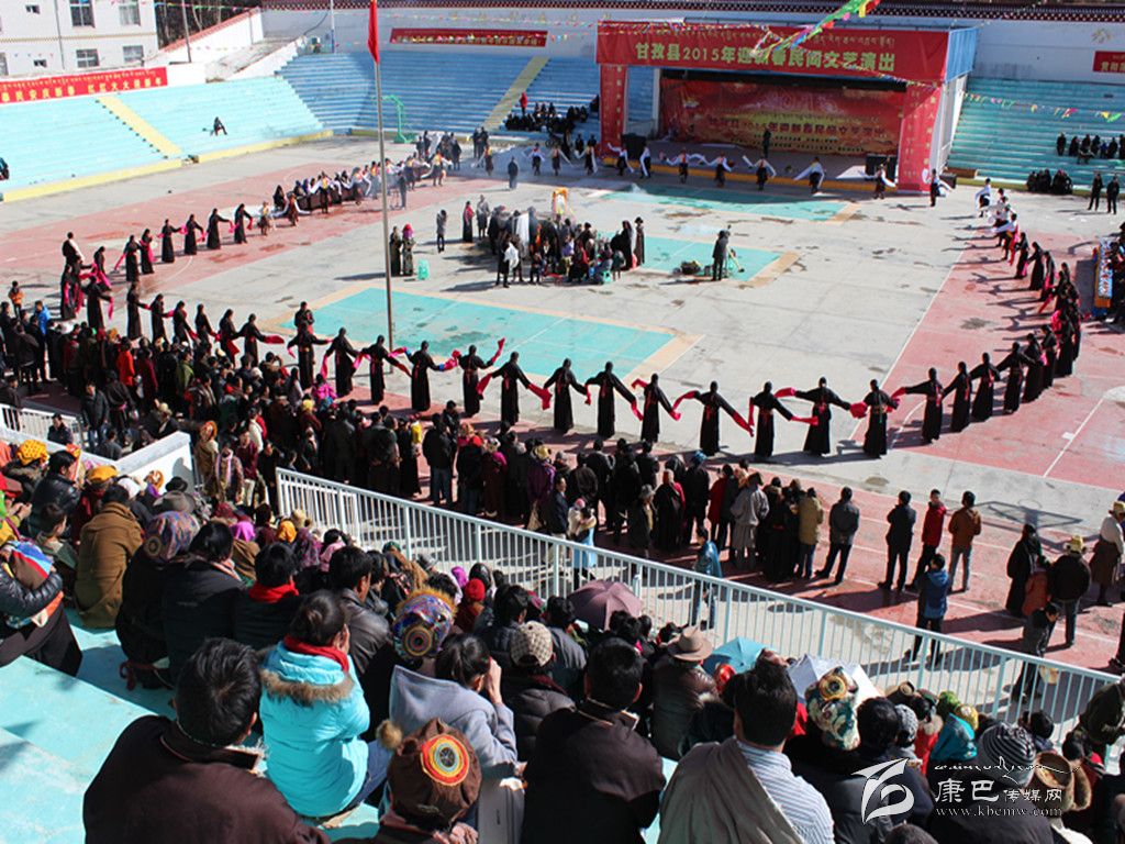 2月21日和22日,甘孜縣中心體育廣場(chǎng)彩旗獵獵,歌舞歡騰,由中共甘孜縣委、縣人民政府主辦,縣委宣傳部、縣文旅廣體局承辦的2015年新春民間文藝演出在這里隆重舉行,來自團(tuán)結(jié)村和瓦巴村的藏族群眾穿上節(jié)日的盛裝,跳起歡快的鍋莊弦子,共慶新年。
