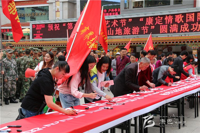 本網(wǎng)訊(記者 宋志勇 文/圖)8月5日,由州文明辦、州直工委、康定市文明辦共同舉行的康定地區(qū)迎“康巴藝術(shù)節(jié)”爭當(dāng)文明市民簽名暨志愿服務(wù)活動在情歌廣場正式拉開帷幕。來自康定地區(qū)社會各界的青年志愿者服務(wù)隊、巾幗志愿者服務(wù)隊、工商界志愿者服務(wù)隊、衛(wèi)生系統(tǒng)志愿者、駐康部隊志愿者服務(wù)隊、州級機(jī)關(guān)志愿者服務(wù)隊、市直機(jī)關(guān)志愿者服務(wù)隊、環(huán)衛(wèi)志愿者服務(wù)隊等共計1000余人參與。