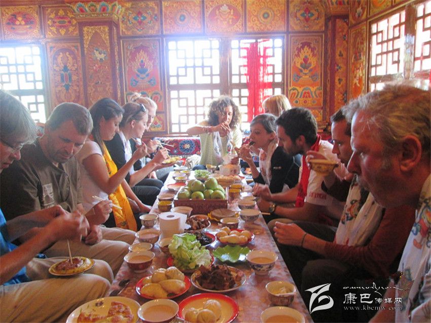 外國游客在道孚民居接待點(diǎn)就餐。