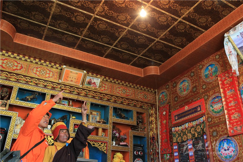 格吉大爺今年70歲了,他的孫子貢嘎是一名藏畫家,主要靠給鄉(xiāng)鄰的新房畫壁畫為生。他和哥哥兩人自學(xué)成才,鄉(xiāng)里很多人家屋內(nèi)那些精美絕倫的壁畫就出自他們兩兄弟之手。以前電不好時(shí),天黑就無法工作,現(xiàn)在有電了,晚上都能畫,曾經(jīng)要畫1個(gè)多月的壁畫,現(xiàn)在20多天就能完成。如今電好了,電話信號(hào)也比以前強(qiáng),好多理塘縣城的朋友都打電話請(qǐng)我去給他們家里畫,這樣又能多掙些錢。貢嘎的話語里透著對(duì)未來的幸福生活憧憬。