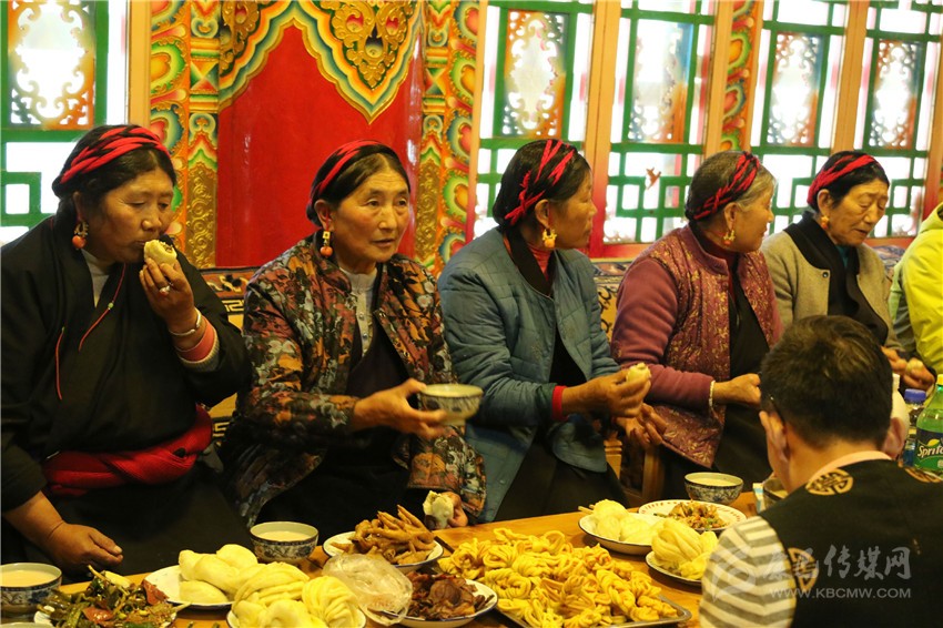 下午3點(diǎn),果子、各種菜品、熱騰騰的包子端上來(lái)了,各種飲料擺滿桌子,親朋好友十余口人聚在澤絨多吉的新家中,端起最愛(ài)的瓊(用青稞釀成的酒),在歡歌笑語(yǔ)中迎接藏歷火雞新年的到來(lái)。