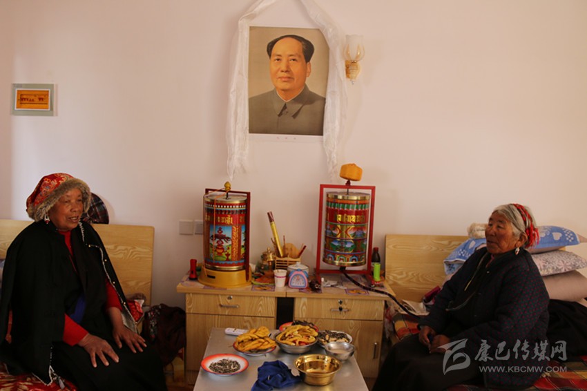 從餐廳出來(lái),記者走進(jìn)了一間15平方米左右的宿舍。兩位老人正坐在各自的木床上看電視,墻上掛著的液晶電視是連著機(jī)頂盒的。兩床之間,放著藏桌和床頭柜,藏桌上有瓜子、花生、酥油果子、牛肉等食品,亞瑪翁青老人熱情地說(shuō):“因?yàn)檎谶^(guò)藏歷新年,這些都是福利院為我們備的年貨,你也嘗嘗!”。房間里最引人注目的便是掛在床頭柜上方的系著哈達(dá)的毛主席畫像,兩位老人指著毛主席畫像動(dòng)情地說(shuō):“毛主席、共產(chǎn)黨是我們的恩人,看著他的畫像我們安心?!贝送?,房間里還有衣柜、配有馬桶的獨(dú)立廁所和盥洗臺(tái),毛巾、漱口盅、掃把、拖把都整齊地放在對(duì)應(yīng)位置。亞瑪翁青笑著說(shuō):“我們住的房間都趕得上縣城里的賓館了?!?/span>