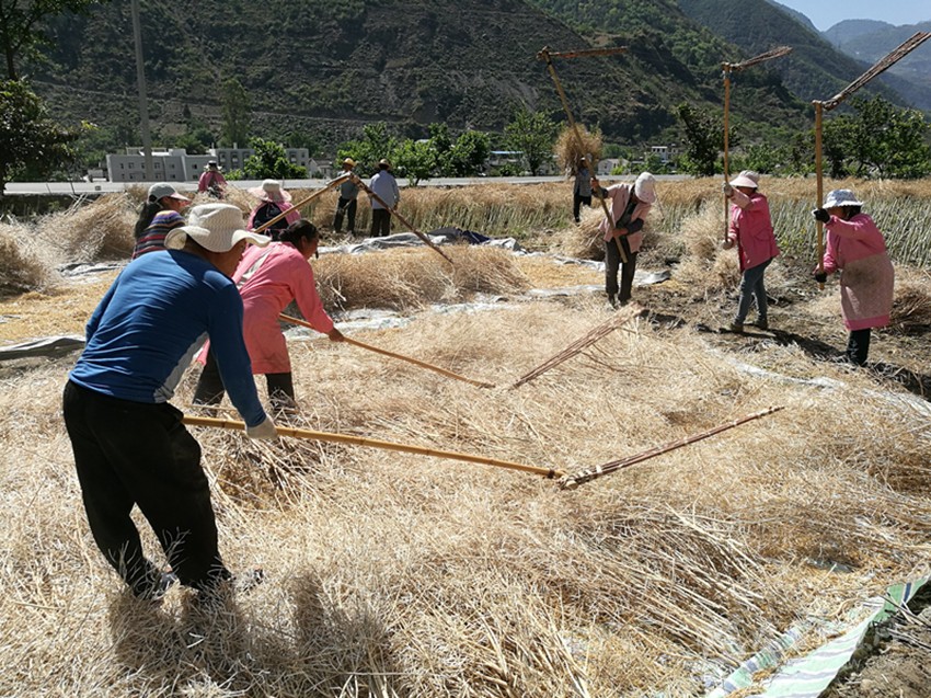 本網(wǎng)訊(尼胡克布 李娟 /圖)512日,在瀘定縣德威鄉(xiāng)下河壩村農(nóng)田里,村民李永強(qiáng)正組織親戚朋友20余人,對(duì)自家3畝多油菜進(jìn)行搶收。村民們有的負(fù)責(zé)把一捆捆曬干的油菜抱到油布上,有的負(fù)責(zé)用農(nóng)具進(jìn)行打籽,現(xiàn)場(chǎng)一派繁忙的景象。
