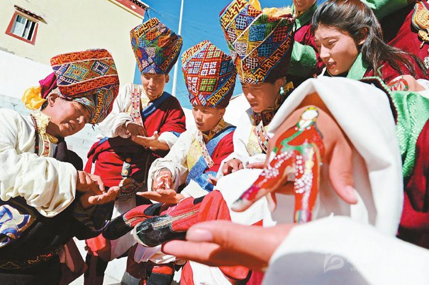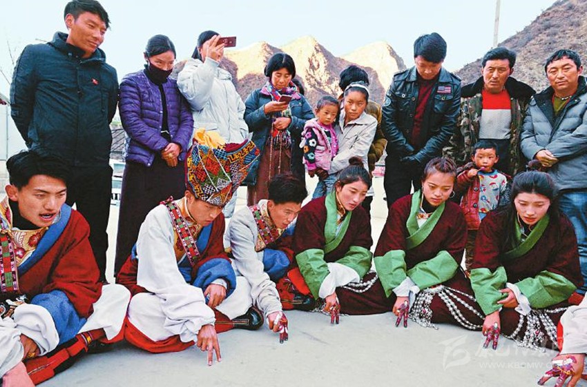2017年12月22日,白玉縣城陽光普照,縣藝術(shù)團(tuán)一群“90后”藏族演員用顏料相互在食指和中指上熟練地繪制著具有當(dāng)?shù)孛袼滋厣娜宋飯D案。音樂響起,演員們的手指隨著節(jié)拍翩翩起舞,左挪右轉(zhuǎn)。隨著唱詞和曲調(diào)的變化,手指的動(dòng)作幅度和節(jié)奏也隨之變化。藝人的情感起伏、喜怒哀樂被“小人”般的手指表現(xiàn)得淋漓盡致。