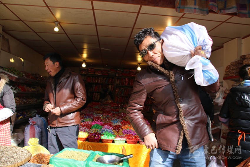走進(jìn)郭達(dá)橋重康糖果店,洛讓說(shuō):“多買(mǎi)點(diǎn)糖果糕點(diǎn),娃娃老婆喜歡。”然后照單點(diǎn)貨:花生10斤、瓜子5斤、葡萄干5斤、水果糖5斤、軟糖5斤、炒米糖10斤……一下就指點(diǎn)了八九種糖果糕點(diǎn)。看到了這樣的生意,老板樂(lè)開(kāi)了花。與洛讓大包大攬的氣派不同,長(zhǎng)期經(jīng)商的扎西老練地詢價(jià):“老板,我們買(mǎi)這么多,要優(yōu)惠喲?!币环憙r(jià)還價(jià)之后,洛讓和扎西買(mǎi)了十種糖果,用去1066元,裝滿整整兩編織袋。洛讓把糖果過(guò)扛在肩上,對(duì)筆者說(shuō):“你來(lái)試一下,有點(diǎn)分量,你別說(shuō),辦年貨也是一種體力活喲?!?/p>