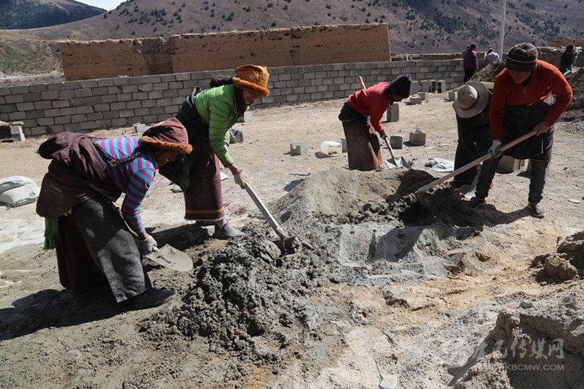 在工程實施中,全組的村民相互幫助,齊心協(xié)力建新房?!白蛱齑蠹?guī)臀野逊孔有薜冒桶瓦m適、漂漂亮亮的。我也來幫四郎曲西建房。這樣你幫我,我?guī)湍悖銕退?,要不了多久,我們這里家家戶戶都會很漂亮?!闭谠鹤永飻嚢杌覞{的村民格絨多登微笑著說。