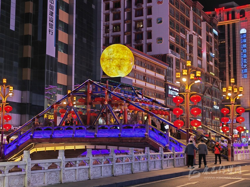 除了讓人眼前一亮的各種絢麗的花卉燈飾和被大紅燈籠、如意掛飾的大街小巷,最被市民津津樂道的莫過于中橋的明月景觀和東關(guān)U形廣場上的“五彩色神?!薄C髟戮坝^又稱《世界的康定》,此景觀以月球?yàn)橹黧w,在橋兩側(cè)再輔助以音符及五線譜造型。其寓意為情歌唱響世界,康定名揚(yáng)世界。而矗立在東關(guān)廣場上的新增雕塑景觀就更意義非凡了。雕塑通體是以一頭雄壯的牦牛形象呈現(xiàn),牦牛下方的紅色高臺正前方鐫刻的是政府公仆一心為民的錚錚誓言?!罢臓I造喜慶洋洋的節(jié)日氛圍,讓我們感受到了濃濃的‘年味’,在黨和政府的關(guān)懷下,我們老百姓的生活一年更比一年好,幸福感也是一年更比一年強(qiáng)。”75歲高齡的扎西激動(dòng)地跟記者分享著他的喜悅。