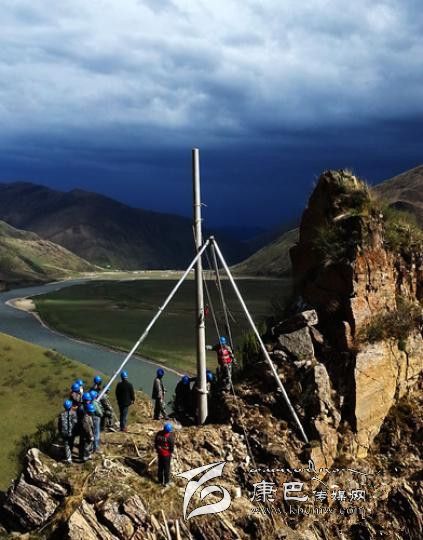 電力施工人員在石渠境內的長須干瑪峭壁上艱難立桿。 陳紅梅 攝