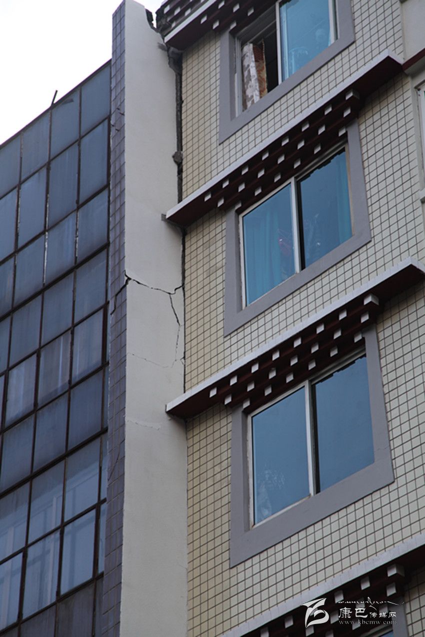剛沖出報社不遠,記者就發(fā)現(xiàn)光明路光明小區(qū)附近的小巷中有一些外墻磚不規(guī)則地散落在地上,抬頭一看,發(fā)現(xiàn)一幢建筑的外墻已經(jīng)脫落了一大塊;在州統(tǒng)計局上側(cè),一幢建筑外墻出現(xiàn)了裂縫,過往的人們都在紛紛觀望,還有人在用手機拍攝。在西大街,有一幢建筑的陽臺出現(xiàn)移位,與主體建筑間形成了裂縫;在州人民醫(yī)院,門診部大樓出現(xiàn)了嚴重裂縫,大樓內(nèi)的人員已經(jīng)全部撤離。記者在采訪中發(fā)現(xiàn),此次地震使康定城區(qū)內(nèi)建筑出現(xiàn)了不同程度的外墻磚脫落、裂縫等,城郊有圍墻倒塌的情況發(fā)生,城區(qū)沒有出現(xiàn)建筑物倒塌的情況。