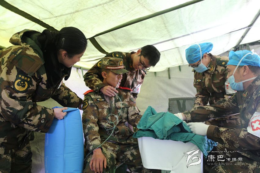 武警二支隊一中隊上等兵楊貞川在搭建板房時,不慎左手拇指深度劃傷2CM,武警四川省總隊醫(yī)院周續(xù)翔副主任與何佳燕護士長對楊貞川實施清創(chuàng)縫合術(shù)。術(shù)中,小戰(zhàn)士突感頭暈,考慮為輕度創(chuàng)傷性休克,鄭聯(lián)護士長立即拿來氧氣袋給予吸氧,并像母親一樣關(guān)心安慰她。手術(shù)在4名醫(yī)務(wù)人員的共同努力下順利完成,手術(shù)完成后醫(yī)護人員向其發(fā)放了消炎藥、并囑其按時換藥,到期扯線。 記者楊珂攝影報道