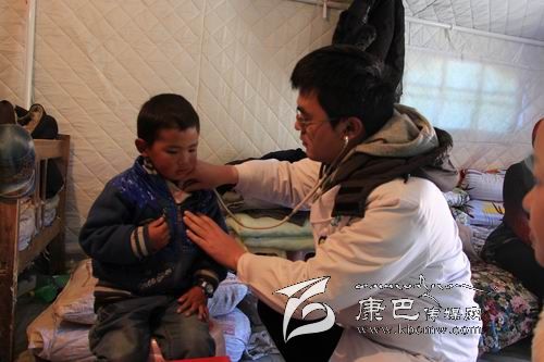 在新都橋鎮(zhèn)東俄洛三村的一頂救災帳篷里,來自“雅安市抗震救災醫(yī)療救援小組石棉分隊”的石棉縣人民醫(yī)院內(nèi)科醫(yī)生李登豐正在給當?shù)貎和恋嵌嗉獧z查身體。土登多吉的母親說孩子這兩天感冒了,經(jīng)過檢查,李登豐發(fā)現(xiàn)土登多吉并未發(fā)燒,只是扁桃體有點發(fā)炎,于是趕緊讓同行的護理人員拿來了治療感冒和消炎的藥物。