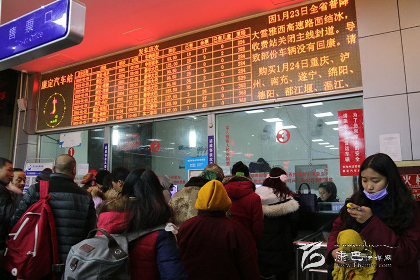 原來(lái),汽車站售票窗口上方的視頻上滾動(dòng)播放著:“因1月23日全省普降大雪,雅西高速路面結(jié)冰,收費(fèi)站關(guān)閉主線封道,導(dǎo)致部分車輛沒(méi)有回康定。請(qǐng)購(gòu)買1月24日到重慶、瀘州、南充、遂寧、綿陽(yáng)、德陽(yáng)、都江堰、溫江、雙流(1402次)、仁壽、眉山、西昌、宜賓、安岳、廣安的旅客到售票窗口退換車票。”