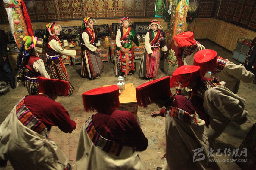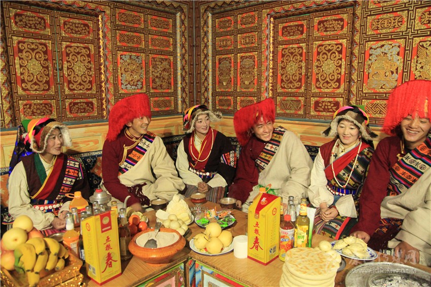 一家人穿上節(jié)日盛裝,按輩序就座。主婦手捧吉祥斗恭恭敬敬地走到長輩跟前說“扎西德勒”,對(duì)方抓幾粒麥子邊向上撒邊祝福說:“扎西德勒!美滿幸福,祝主婦身體健康,預(yù)祝明年大家仍如此團(tuán)聚歡慶?!痹僮ヒ稽c(diǎn)切瑪送進(jìn)嘴里。家庭儀式后,家中兩人一個(gè)拿青稞酒、銀酒碗,一個(gè)手捧切瑪,到左鄰右舍、親朋好友家拜年,敬獻(xiàn)切瑪、青稞酒,互相祝福。