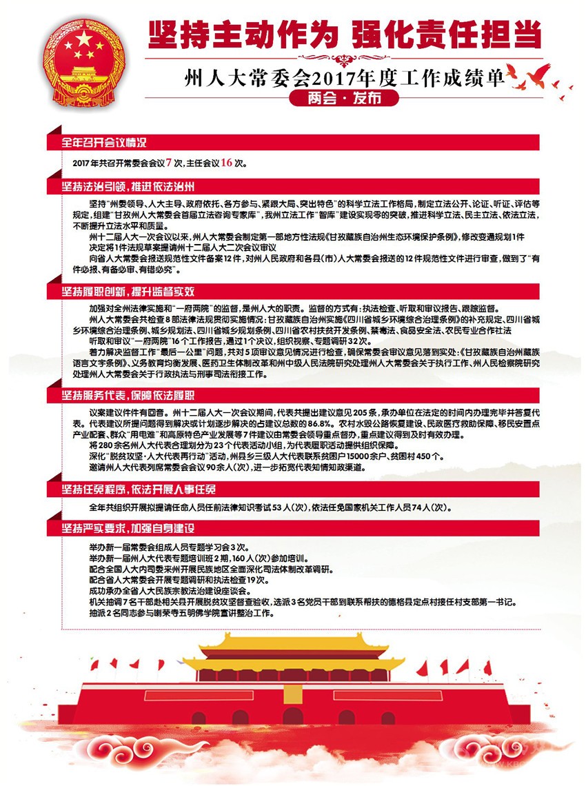 2017年是州十二屆人大常委會各項工作的開局之年,在中共甘孜州委的堅強領(lǐng)導下,常委會圍繞中心,服務(wù)大局,依法履職,圓滿完成了州十二屆人大一次會議確定的各項工作任務(wù)。