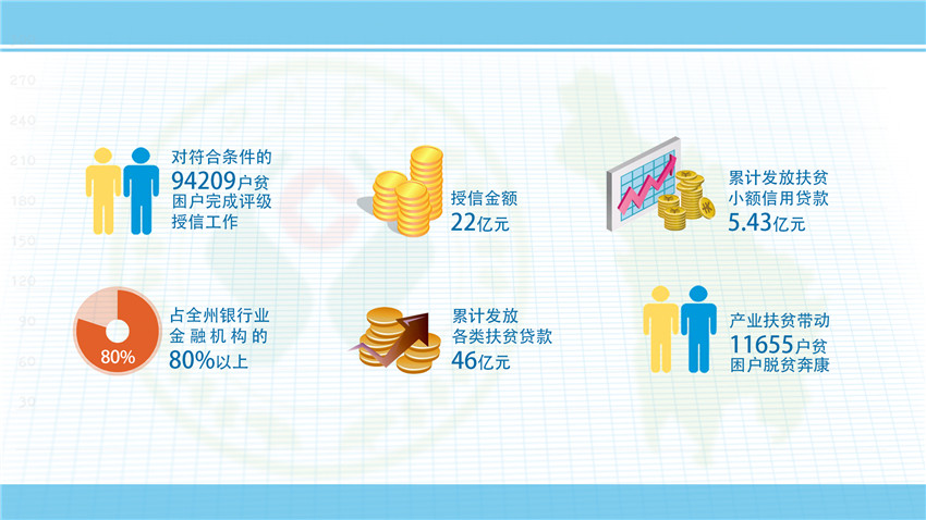 ——強(qiáng)化信貸扶持。緊緊圍繞全州脫貧退出總體目標(biāo),打破各縣劃分片區(qū)、劃分任務(wù)的局面,使脫貧攻堅(jiān)工作從行政手段調(diào)整到市場競爭和民生工程兼顧,堅(jiān)持“三個(gè)一百”——即百分百對符合條件的建檔立卡貧困戶進(jìn)行評級授信,授信面達(dá)到100%;百分百滿足貧困戶有效信貸需求;百分百滿足產(chǎn)業(yè)帶動(dòng)扶貧項(xiàng)目有效信貸需求,加強(qiáng)與18個(gè)縣黨委政府的溝通對接,瞄準(zhǔn)每個(gè)縣的地方特產(chǎn)產(chǎn)業(yè),因地制宜,為每個(gè)縣量身打造“一縣一策”的金融服務(wù)方案,累計(jì)發(fā)放各類產(chǎn)業(yè)、項(xiàng)目帶動(dòng)扶貧貸款20.69億元。
