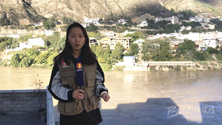 得榮電視臺記者在報(bào)道身后金沙江的水情變化。