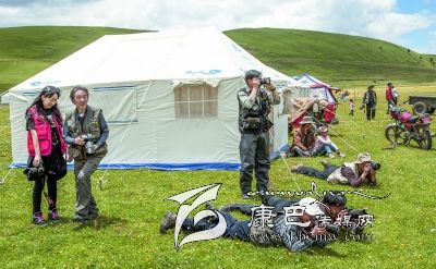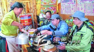 位于宗塔草原“大盆地”東邊山坡的降巴牧場在隊(duì)員們的心里也留下了深刻的印記。15日早上5點(diǎn)半隊(duì)員們就出發(fā)上了降巴牧場。朝霞映紅了天邊,紅云罩著青草牛糞味飄香的草坡。比采風(fēng)隊(duì)員們起得更早的牧人已擠完了牛奶,一個僅10 歲的女孩正在草坡上拾牛糞;牛毛帳篷里,勤勞的牧婦已打開了牛奶分離器開始分離酥油了……一問,方知牧民們今晨4點(diǎn)就起床勞作,干完早上的活兒,他們要趕到三公里遠(yuǎn)的“盆地”耍壩子,看賽馬。這個牧場靜謐潔凈得令人稱奇,青青的草坡上絕少有垃圾存留,沒見到一只兇惡的牧犬;按季節(jié)劃分的草場由整潔的網(wǎng)圍欄圈開,分隔有致;牧人舉家出門,連帳篷門也不掩,據(jù)說這里沒有偷盜發(fā)生,家人和諧;古老、平和的氣氛中,晨風(fēng)輕拂,野花青草搖曳,輕柔的晨霧中偶而傳來兩聲牛哞,讓人頓感心靜如水。對于長期居住城市的人來說,這里無疑是“幽雅天堂”了。