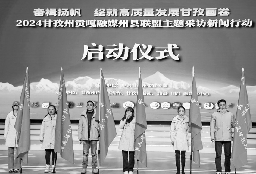 本網(wǎng)訊 為著力建設(shè)習(xí)近平文化思想涉藏地區(qū)生動(dòng)實(shí)踐地的“甘孜樣板”,奮力打造中華文明和康巴文化傳播的“甘孜窗口”,努力創(chuàng)造宣傳思想文化工作的“甘孜品牌”,2月28日,以“奮楫揚(yáng)帆 繪就高質(zhì)量發(fā)展甘孜畫卷”為主題的甘孜州貢嘎融媒州縣聯(lián)盟主題采訪新聞行動(dòng)在州廣播電視臺(tái)文藝演播大廳啟動(dòng),一場(chǎng)圍繞中心、服務(wù)大局的新聞實(shí)踐,分批推進(jìn)、貫穿全年的統(tǒng)一行動(dòng),新聞戰(zhàn)線協(xié)同聯(lián)動(dòng)、各展其長(zhǎng)的創(chuàng)新探索至此拉開帷幕。