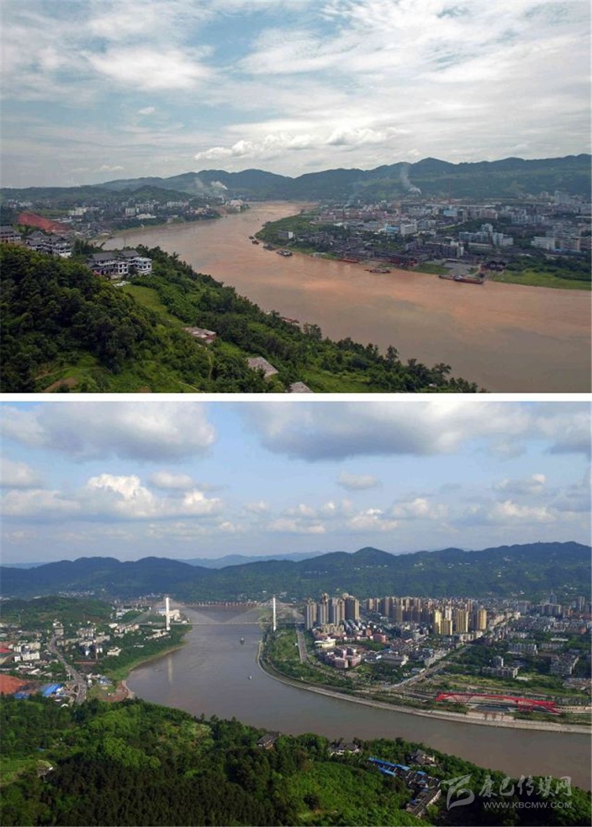 拼版圖片:上圖為2014年7月拍攝的宜賓市南溪區(qū)兩岸江景;下圖為2016年4月在同一視角拍攝的畫面。新華社發(fā)(曾朗攝)