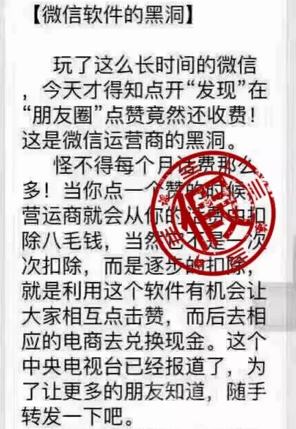 近日,微信群中流傳一條消息稱:“玩了這么長時間的微信,今天才得知點贊竟然還收費。當(dāng)你點一個贊的時候,運營商就會從你的話費中扣除八毛錢……中央電視臺已經(jīng)報道了?!?/p>