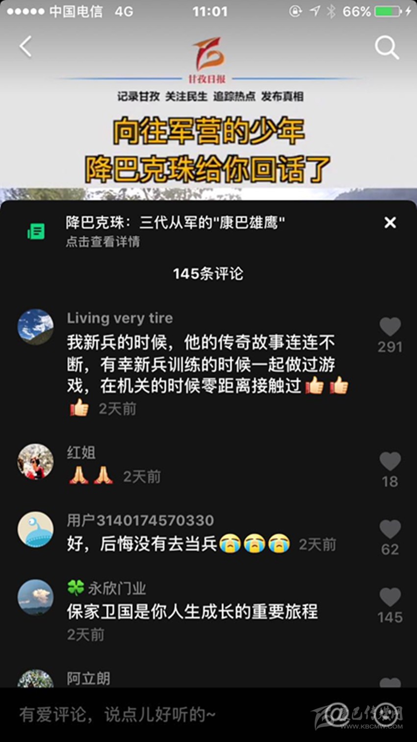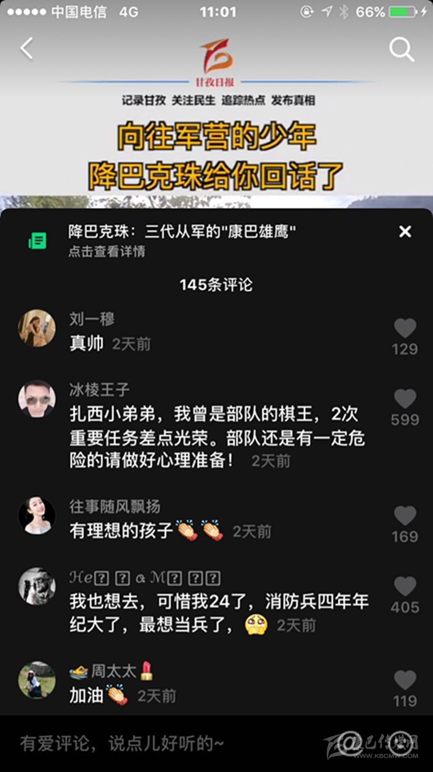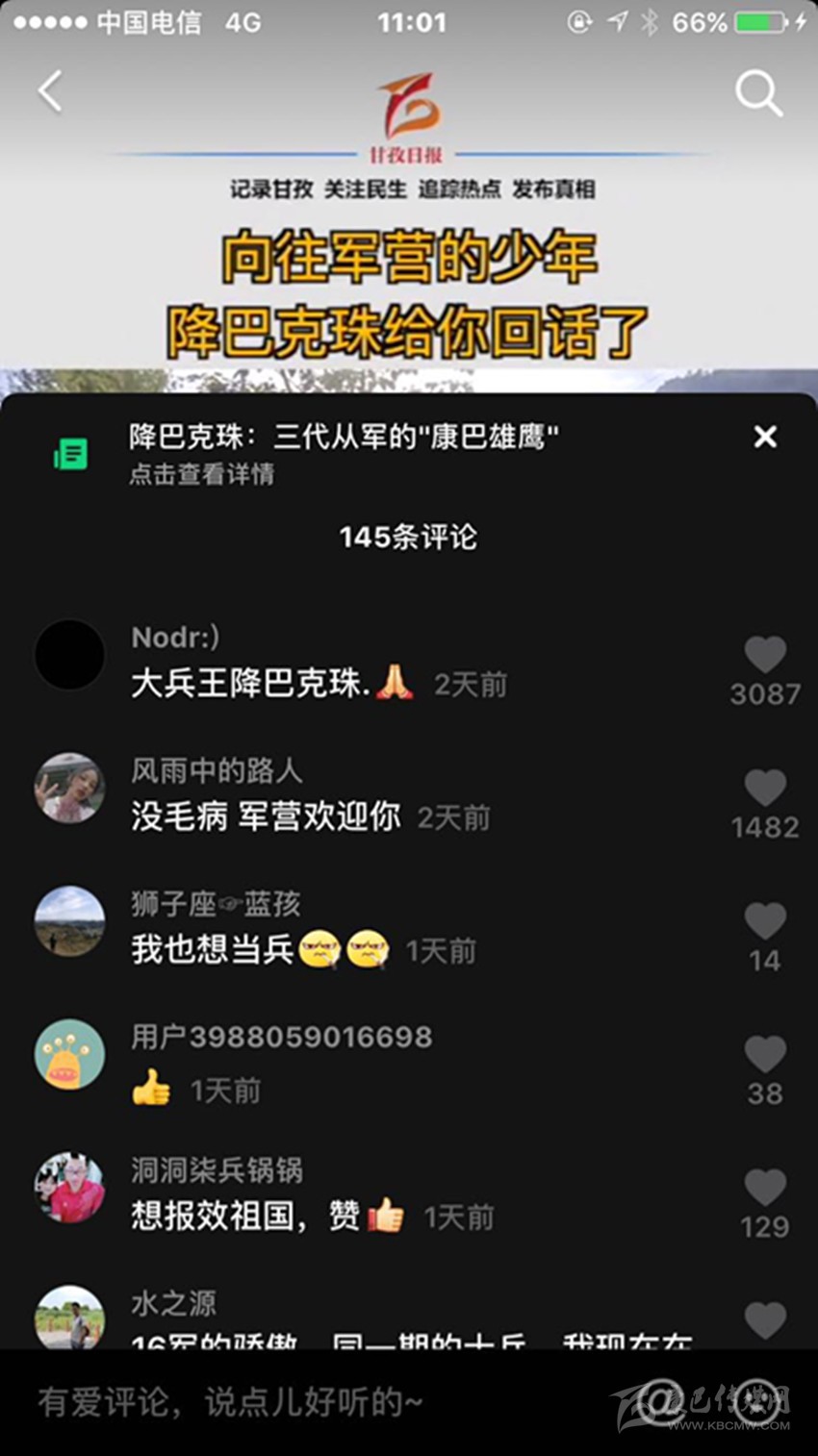三段視頻,六百多條留言,近兩千萬次播放,一個(gè)藏族少年的軍旅夢在網(wǎng)絡(luò)上熱烈綻放,而農(nóng)牧區(qū)許多青年的軍旅夢也就此被點(diǎn)燃,忠勇大愛的“血脈”在康巴高原傳承! (本網(wǎng)記者 肖宵 整理)
