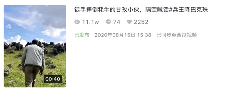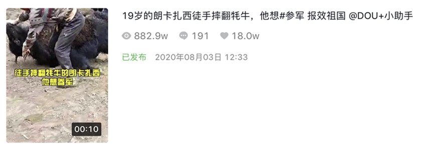 8月3日,這段僅有10秒長的視頻,在抖音短視頻平臺《甘孜日報(bào)》康巴傳媒抖音號發(fā)布后,短短一天內(nèi)獲得了800多萬次播放量,200多名網(wǎng)友留言評論,18萬次點(diǎn)贊更是“宣告”其正式成為“網(wǎng)絡(luò)爆款”。