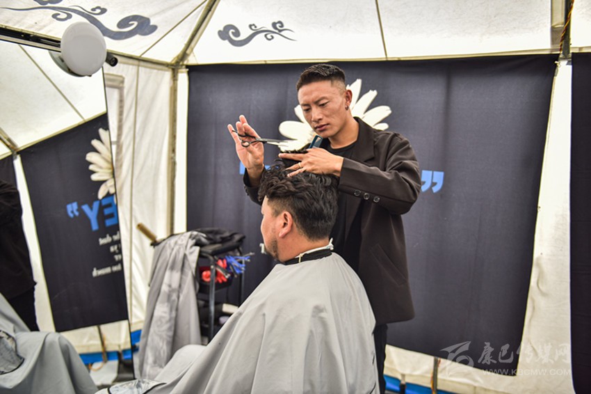 “有很多康巴漢子找我做造型,上個(gè)月,我把小帳篷換成了現(xiàn)在的大帳篷,進(jìn)行了一些簡(jiǎn)單的裝飾,能容納更多人,大家剪頭發(fā)更方便了,游客也能看到更精致的康巴漢子?!鼻鸁羯V樽院赖匦χf(shuō)。