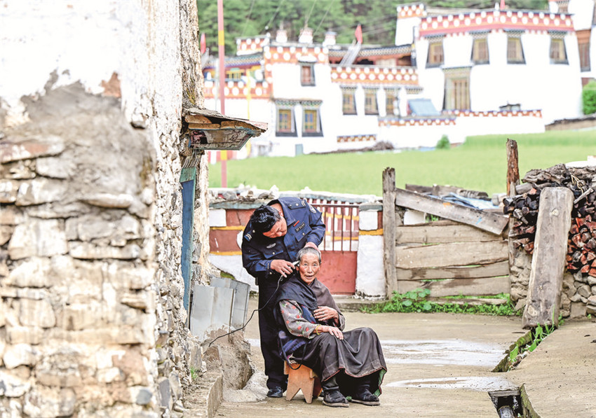 每個(gè)月,在忙完派出所的工作之余,呷老多燈就會(huì)帶著提前準(zhǔn)備好的大米、油、面、肉等生活用品送到老人家中。然后自己秒變“托尼老師”,為老人理發(fā)。平時(shí),只要有時(shí)間,呷老多燈就會(huì)來到擁中呷的家中,陪她聊聊天,讓老人不再孤獨(dú)。面對(duì)這般不期而至的溫情,擁中呷老人飽含淚花地說:“感覺自己的兒女回家了!”
