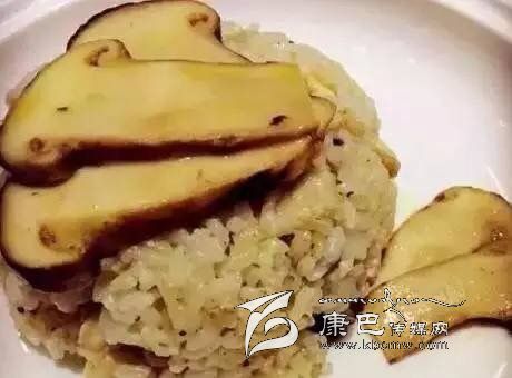 松茸飯:新鮮松茸4個,去泥腳,表面清理后切丁,梗米淘洗,少許黃油煸香松茸丁,加入梗米翻炒2分鐘倒入電飯煲, 電飯煲加水:米 1:1,松茸飯煮熟后倒入少許生抽拌勻即成。