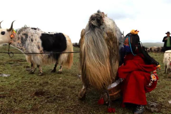 純純的牦牛奶是甜甜的、濃濃的、厚厚的、奶味十足??梢园阳佤稳喑缮鬃拥男螤畛耘D蹋豢隰佤闻湟豢陉笈D?。