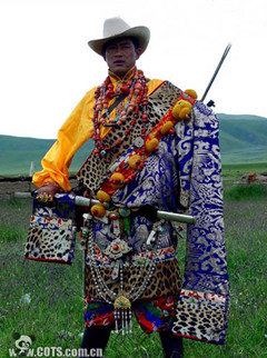 吐蕃時期   藏族服飾文化有了較大的發(fā)展。"中二丁王"時(相當(dāng)于中原西漢中期),南方雅隆河谷的吐蕃開始了冶煉鐵、銅、銀等礦產(chǎn),為金屬飾品的出現(xiàn)創(chuàng)造了條件。藏史記載,公元三世紀(jì)的拉妥妥日年贊時,吐蕃贊普的服飾巳與眾不同,出現(xiàn)了服飾等級的差異。史載松贊干布時期,吐蕃的歷史翻開了新的一頁,吐蕃文化得到迅速的發(fā)展,其服飾文化日漸發(fā)達。吐蕃奴隸制王朝等級森嚴(yán),在服飾上的表現(xiàn)也日臻完備。從反映吐蕃盛時的敦煌壁畫可看出,君臣服飾的等級差異,藏王一般只有贊普才能使用的三瓣寶冠箍住的有凹槽裝飾的無沿帽,呈紅色,通常高于一般人的帽子;藏王的侍從或臣下往往戴平頂無沿帽。衣袍的式樣也各有不同,官吏的章飾規(guī)定有一等瑟瑟,二等金,三等金包銀,四等銀,五等銅,六等鐵等大小兩類,共十二級,裝在方圓三寸的盒子里掛在胸前,以區(qū)別職位的高低。武將的頭盔有形如塔的裝飾,戰(zhàn)士頭盔上有三只彩旗以表示出生的年月,隨著"惟以淬礪為業(yè)"的吐蕃冶煉業(yè)的發(fā)展,軍隊的鎧胄日趨精良,有的周身僅露兩個眼窩,勁弓利刃常不能破,其威嚴(yán)、勇猛之氣在今天大昭寺壁畫的吐蕃武士像中尚歷歷在目。吐蕃貴族不僅本人穿著華貴,還在聚會宴客時,把傭人裝飾起來。而作為贊普的松贊干布則用一種紅帶子包頭,身著長袍,足穿腳尖朝上的靴子,據(jù)《紅史》載,這種王服是受波斯王朝的影響,反映了文化交往已影響到了服飾文化層次,而從松贊干布伊始的吐蕃與中原的密切交往,兩種民族文化的長期接觸更為藏族服飾的發(fā)展注入了新鮮血液。史載文成公主進藏時,帶入諸種花緞、錦、綾羅與諸色衣料二萬匹,還有大量的金玉器具。松贊干布及吐蕃大臣紛紛自行去掉氈裘,改穿絹綺。近代西藏的高級官吏,頭發(fā)綰成一髻,戴金翅白紗帽,這是唐代進士的服飾。此外,還采納文成公主建議,令國人禁止"赭面"(用油涂面),文成公主進藏還帶來了種植蠶桑和紡織技術(shù),"植??椊z兮"大大的促進了吐蕃服飾技藝的發(fā)展,青海海西州都蘭出土的大批吐蕃服飾文物,真實、生動地反映了吐蕃服飾的工藝水平。服裝的織物紋樣多為聯(lián)珠動物紋,裝飾品的金質(zhì)首飾、佩飾的精美使人嘆為觀止。今天藏族婦女飾品的鑲嵌形制,可以從這些文物中找到原型。斯坦因的《古代中亞文化遺跡》一書也曾提到:"在吐蕃發(fā)現(xiàn)的遺物中,有很多具有花紋的絲織物,花紋中有些是印的,有些是織的,花紋圖象的變化很多,這一點很可以表示吐蕃商業(yè)的地位,……大概是中國與西亞之間的貿(mào)易重點。"頻繁的交往促進了吐蕃經(jīng)濟的發(fā)展,也促進了服飾文化的發(fā)展。 吐蕃是一個軍事帝國,在它的發(fā)展過程中征服融合了青藏高原及其邊緣地區(qū)的許多其他民族,這是造成今天各地區(qū)藏族之間文化差異的重要原因。在服飾的表現(xiàn)上也是如此。吐蕃時代這種差異主要表現(xiàn)為東女、附國、黨項等部落服飾的不同,東女部落住在康延川(今昌都),處于母系氏族社會發(fā)展階段,其女王穿青毛綾(氆氌)裙,上披青袍,袖長到地,冬穿用文錦裝飾的羔裘。發(fā)作鬟髻狀,兩耳垂珰(耳環(huán))。足穿革素(皮靴)。一般男子披發(fā),婦女辨發(fā),男女都用彩色涂面。王死居喪三年,不易服,不梳洗。附國是以今四川甘孜為中心,包括今四川阿壩一帶的嘉絨藏人的藏羌融合體。他們頭戴圓形皮帽,或帶幕離佳(即面罩一類飾物,為婦女所帶)。身披毛曷毛(氆氌一類)、皮裘,穿牛皮鞋。頸系鐵索,手貫鐵釧。王與酋長以金為首飾,胸前掛著三寸長的金花。黨項則是純游牧部落,"服氈襲褐,披氈以為上飾",早在北周時巳能制造精美的犀甲、鐵鎧。四川西北部還有屬黨項部落聯(lián)盟的鄧至、武興國和宕昌等,服飾習(xí)俗為頭藏烏皂突騎帽,身穿長袍,下著小口褲、足穿皮靴,與今四川牧區(qū)藏族服飾相似。此外青海地區(qū)有吐谷渾,貴婦人披錦袍,戴金花冠。如女發(fā)型為辨發(fā)披于后,后飾珠貝,以繁多為高貴,這一服飾與今青海藏族婦女大致相同。這些地區(qū)服飾特征是今天各地不同藏族服飾的母型。 吐蕃王朝崩潰后,從九世紀(jì)中期到第十一世紀(jì)的二百余年間,西藏社會一直處于分裂割據(jù)的混亂狀況。這一時期戰(zhàn)亂不堪,服飾藝術(shù)的發(fā)展也難免厄運,停滯不前,而與戰(zhàn)爭有關(guān)的武士服飾卻濟時發(fā)展。在西藏阿里古格王國的遺址中,發(fā)掘有大量古代武士的盔甲和武器。其鎧甲多為鋼片甲,是用細皮條串結(jié)鋼片而成,串結(jié)方法頗為復(fù)雜,武器中的盾牌,系用藤條編織為圓形,直徑八十厘米,正面鑲有銅質(zhì)加固件,銅件上雕刻有細密的紋飾,故亦可謂是銅飾件,背面有四個銅環(huán),環(huán)間可用皮條相連,作握柄之用,無論這些服飾和兵器,是西藏本地生產(chǎn),還是外來流入,都說明其時西藏的武士服飾已具鮮明的本土特征與個性。 佛教僧侶服飾興起  這一時期的服飾發(fā)展還有一個特點就是佛教僧侶服飾的興起。公元八世紀(jì),西藏出現(xiàn)了第一批僧人,服飾由贊普府庫供給,后由百姓、政府共同供養(yǎng)。佛教服飾亦形成等級區(qū)別,并有節(jié)日與平時的不同裝束,自成體系。不少上層僧侶生活奢侈,衣著華麗,"下