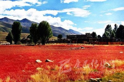“紅草地”的后面是一個(gè)小村莊,村莊的周圍也有一些白楊樹(shù),在秋風(fēng)的熏陶下大都已變成金燦燦的黃色?!凹t草地”的四周被幾座大山所環(huán)抱。晚秋中,五顏六色的大片色塊亮麗張揚(yáng)地組合在一起,水天同彩地纏綿出一幅斑斕、夸張、濃墨重彩的油畫(huà)山水。在黃綠相間的楊樹(shù)和藍(lán)天白云的映襯下,紅得特別的燦爛。一片只有足球場(chǎng)大的紅草地,每年只有十多天的風(fēng)光,是成了稻城一個(gè)標(biāo)志性景點(diǎn)。